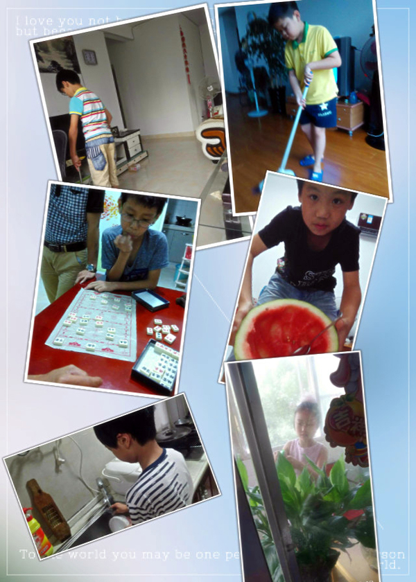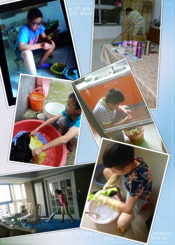 随着网络时代的到来,微信成了我们生活中必不可少的通讯方式。本学期,我在班级建立了“五(2)微信群”(现在已经被热心的致远妈妈更名为“爱操心的人”),目前已经将所有家长纳入群内,群内总人数已达61人。6月22日下午4:00,我在班级召开了半个小时的散学会,布置了作业和假期要求,要求家长及时用微信沟通孩子们的假期表现。没想到,第二天惊喜就来了。23日一大早,范懿萱妈妈就将孩子在家洗碗的图片发到了微信群中,看到孩子主动洗碗,欣喜之情溢于言表。看到了小范同学的照片,许多家长都竖起了大拇指,孩子们更是按捺不住了,纷纷行动起来:申巧云、华文浩、黄贝舜、陈言强、胡亦雯、麦铭杰……买菜、做饭、洗碗、洗衣服,服务一条龙;李思豫在自家的超市里干起了收银员的工作;孙琪华在爸爸开的饭店里当上了服务员;宋呈昊早晚跑步,开启健康生活模式;从来不会干活的段贤豪自己刷起了鞋子;最可爱的还有校足球队的“最佳射手”张宇轩,天天苦练吃西瓜,打算在夏令营的比赛中一举夺魁……