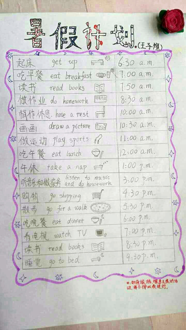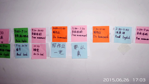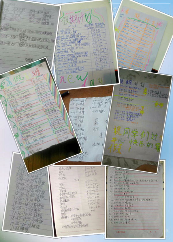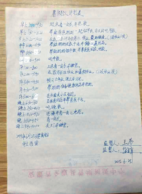 放假前和孩子们约好的考后三天放松时间转眼就过去了。按照我们的约定,6月26日和27日,也就是假期的第四天和第五天,孩子们必须和家长一起制定暑假计划和每日作息时间表,并且上传“爱操心的人”微信群。下面就来看看孩子们的计划吧!王子煊是班级的“小才女”,她的作息时间表不但整洁美观,而且图文并茂,中英结合,很有咱们“世外学子”的特色; 华文浩是个小男生,总也有调皮的时候,他自己制定了作息时间表,还主动请爸爸妈妈签名监督,有了爸爸妈妈的大力支持,看来这个假期他一定会有不小的收获;沈琦是个有个性有创意的孩子,她将每天不同时段的任务用不同颜色的彩纸誊抄张贴出来,条理非常清晰……两天时间,总计收到孩子们的假期计划39篇,全部由家长拍照上传。虽是小小的假期计划,家长的参与度却达到了100%,得到了家长们的大力支持和认可。