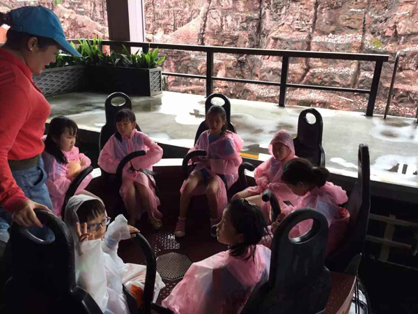 天公似乎要消减同学们的兴致下起滂沱大雨,但这雨反而激发了所有同学的挑战雨中的“激情与速度”。瞧,他们已经迫不及待地涌进乐园了。你知道吗?主题乐园是位于桂林市兴安县,占地60公顷,是一个集时尚、缤纷、浪漫、动感、刺激与欢乐于一体的大型游乐场所。园区有欢乐中国城、美国西部区、梦幻世界区、海盗村、南太平洋区、欧洲区、曼陀罗园等特色主题区,成为桂林旅游又一颗闪亮明珠,并已成为到桂游客必游的新地标。合肥世界外国语学校的同学们兴致盎然地边游边挑战刺激的项目,时不时能听到鼓掌声,欢呼声,尖叫声……再配上风声、雨声与心跳声,真是声声入耳,声声入情。