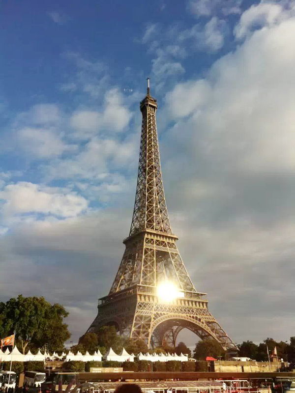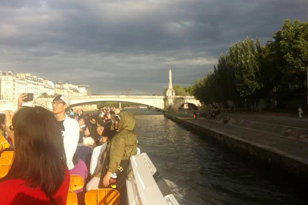 游玩凡尔赛宫后,已是当地近傍晚时分了,我们在导游的带领下来到了塞纳河畔。放舟塞纳河就能将巴黎的浪漫与文化尽收眼底,就能对巴黎了解一二,就能对人说“我去过巴黎”。登上游轮,看着黑白棕黄各种肤色的人散坐在船上,穿着各族的服饰,说着谁也听不懂谁的语言,俨然如联合国刚刚散会在这儿闲息。我们原来以为听不懂解说,可是没过一会儿广播里便传出那亲切的华语解说,心中颇有几分得意。据说前几年还没有华语解说,是祖国的发展与强大,让更多的华人走进了巴黎,让这儿的主人觉得有必要选用华语解说了。