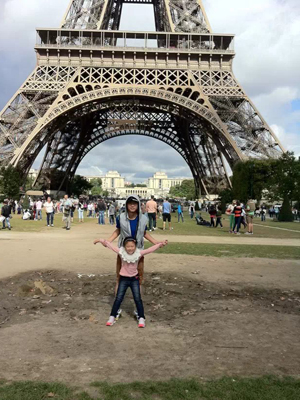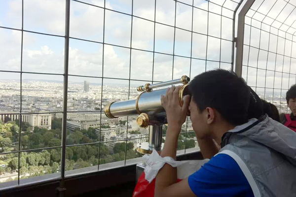 从远处望去,埃菲尔铁塔高耸入云,十分壮观,怪不得可以从其最高处眺望巴黎的盛景。天气很好,蓝天白云,风也来得清爽。可是,我们依然提心吊胆,生怕老天爷突然阴下脸来从天上“洒水”。我们从铁塔底端向上望去,大家不约而同地哇了一声,怎么这么高啊!制作铁塔用的铁锻似乎杂乱无章,但细细一看原来都各归各位,井然有序。上面,人头攒动,只见人们的脚底。在等待乘电梯等铁塔的时候,我们的老师和导游分组开始给学生们讲铁塔的故事。那一年,一是法国大革命,二是世界博览会。巴黎政府决定在巴黎建一座纪念碑来纪念,虽然好多人反对,但铁塔最终成了巴黎的标志。过了一会,终于登塔。巴黎确实风景如画,花花绿绿的房子和三角形的屋顶,处处洋溢着通话色彩,这样的盛景令人难忘,大家拿起望远镜鸟瞰巴黎,巴黎果然别具一格。当然,来到埃菲尔铁塔,若这么匆匆,自然不甘心的。我们师生在上面足足呆了一个小时,了解铁塔的历史以及各种人文趣事,真正做到不虚此行。