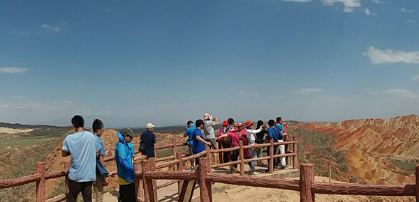 乘车到第四景区,我们要爬到一个山丘顶上,我们沿着连绵的山丘往前走会到张艺谋拍摄的三枪拍案惊奇里面的麻子面馆,山不太高,看到许多游客爬的上气不接下气,对我们这帮孩子来说是小意思。上了山顶,登高望远,整个丹霞景区的美丽尽收眼底,感慨时间的奇妙。蔚蓝色的天空,祁连山的白雪,红色的丹霞地貌,红蓝白融为一体,仿佛是一幅层次感很强的油画,忍不住的惊叹大自然的神奇。