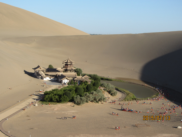 下了鸣沙山下了骆驼天也全亮了。顺着方向走便看到月牙泉,沙漠里的一点明珠。月牙般的泉水,清澈透明,层层波纹荡漾。