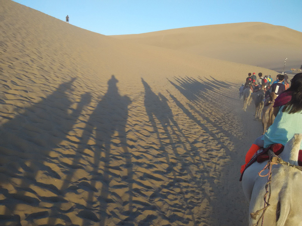 大西北的早晨并不像个夏天,反而像是个带着凉意的秋天。鸣沙山的脚下迎来了我们世外学子,惊喜的是太阳公公还没有露出面来,哆嗦着套上鞋套排着队领着号头寻找我们的坐骑——骆驼。找到属于自己的骆驼便开始真正的沙漠日出之旅。伴随着骆驼的步伐我们缓慢的走近鸣沙山,此时天是蓝的发紫的,天际露出一条红色的“线”。慢慢来到半山腰太阳也冉冉升起,与沙漠连为一体,像是躲在沙堆后面开始露出脸庞。它俏皮又不失庄重。就这样在鸣沙山我们迎接新的一天。