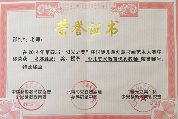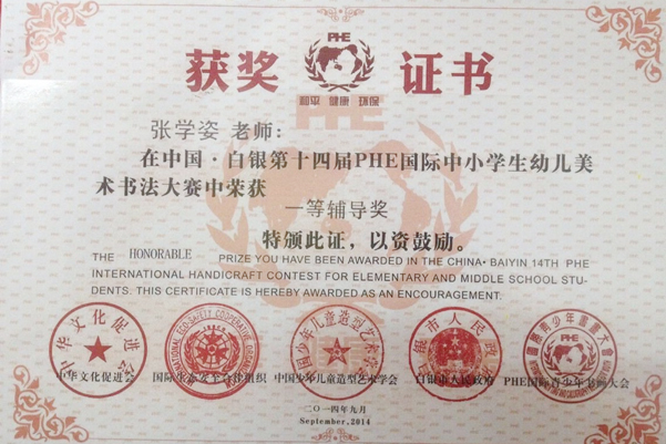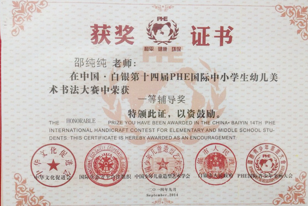 近日,小学综合组喜报频传。继小学美术老师张学姿教学论文获合肥市一等奖之后,由邵纯纯、张学姿两位老师辅导的学生参加“2014年第四届“阳光之美”杯国际儿童创意书画艺术大赛”及“第十四届PHE书画大赛PHE杯”两项全国绘画比赛活动,接连取得优异成绩,25名学生分获一等奖、二等奖、三等级及优秀奖。