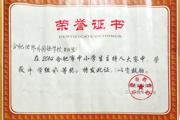 11月26日,合肥市第四届中小学生校园主持人大赛在合肥46中南区拉开帷幕,来自全市县区91所学校的近百名中小学生参与了本次比赛。 市教育局还特别邀请省、市电视台著名主持人担任评委,现场进行点评,以更好地提高选手参赛水平,增强专业性。通过激烈的角逐,合肥世界外国语学校高三(3)班黄佳慧同学荣获二等奖。