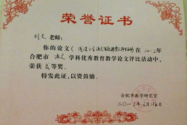 刘文老师的论文获得合肥市论文评比二等奖