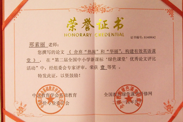 本次活动是由中国教育学会基础教育评价专业委员、全国教师绿色课堂研修网主办,旨在提升全国基础教育领域一线的中小学学科教师的教育教学水平,提高基础教育的教学质量,而举办的全国性评比活动。来自全国各地众多优秀论文和教学设计在这个平台上相互PK,获奖率仅有15%。邢老师在本次论文和教学设计评选中能够脱颖而出,显示出了其过硬的基本功的和超强实力。同时为推动和促进我校外语学科建设,起到了很好的示范和引领作用。