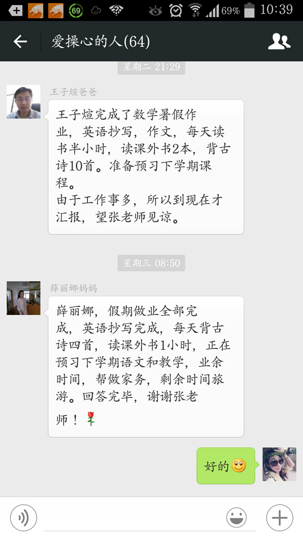 假期的日子,总是欢乐而匆忙,孩子们的假期已经一月有余了。尽管在散学会上,我明确给孩子们安排了学习任务,孩子们也兴致勃勃地制定了假期计划,但是孩子毕竟是孩子,到底完成了多少呢?于是,我在7月10日和7月22日利用“爱操心的人”微信群,对学生们的作业、阅读等情况进行了两次检查。