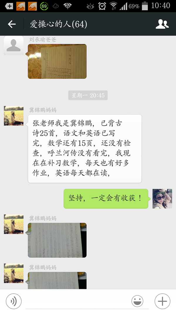 在7月10日的检查中,我没有提出作业的量化检查指标,而是让家长上报所完成的作业量。真是不比不知道,一比吓一跳。有的同学抓得紧,刚刚20天,就完成了三本假期作业;而有的同学却才开了个头,看到别的同学汇报作业,很是惭愧,私信给我,重新规划了学习任务。在给了孩子们一些鼓励和指导意见后,7月18日,我提前在群里告知了22日的检查内容:①读后感一篇,②读书签字至少15次,③英语抄写作业,④古诗的背诵情况。第二次的检查结果,令人欣喜多了。80%的同学已经达标,冀锦鹏、范懿萱正在自查暑假作业,李思豫古诗80首已经全部背完,宋呈昊、薛丽娜已经开始预习六年级的课程了……本次检查家长反馈率达到了95%。