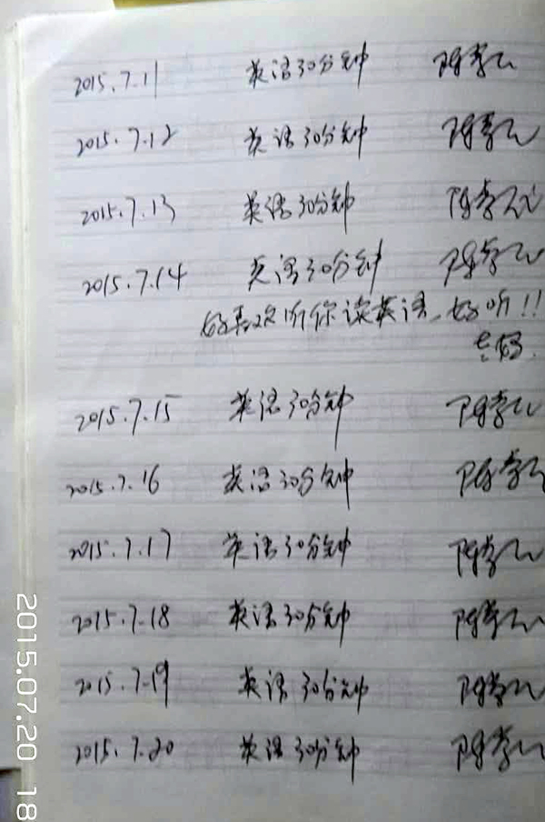 其实,监督并不是目的,在难得的假期里,我真切地希望家长能以平等的身份参与到孩子们的生活去……在家长反馈的照片中,沈琦妈妈的一句话让我特别感动:“20150714,英语读30分钟,好喜欢听你读英语,好听!老妈”……