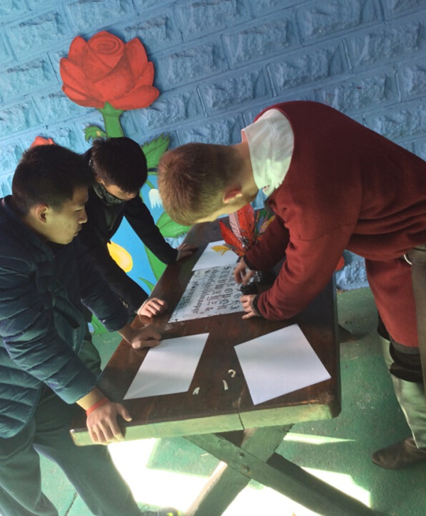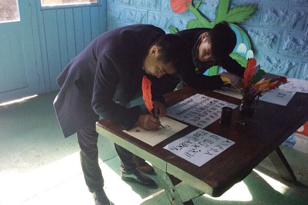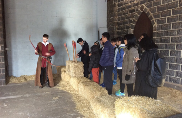 参观完骑士的天堂,我们接着去了文艺的世界——体验中世纪的英文花体字的书写。虽然我们都学习过英文,对英语字母十分熟悉,但面对那一个个漂亮、飘逸但又繁复多变的字母却无从下手,而且我们手拿的可是中世纪的笔——羽毛笔,漂亮但很难掌握。不过老师讲解后,我们一个个跃跃欲试,起笔落笔间,我们各自用英语花体字在证书上写下自己的名字,留下了难得的纪念。