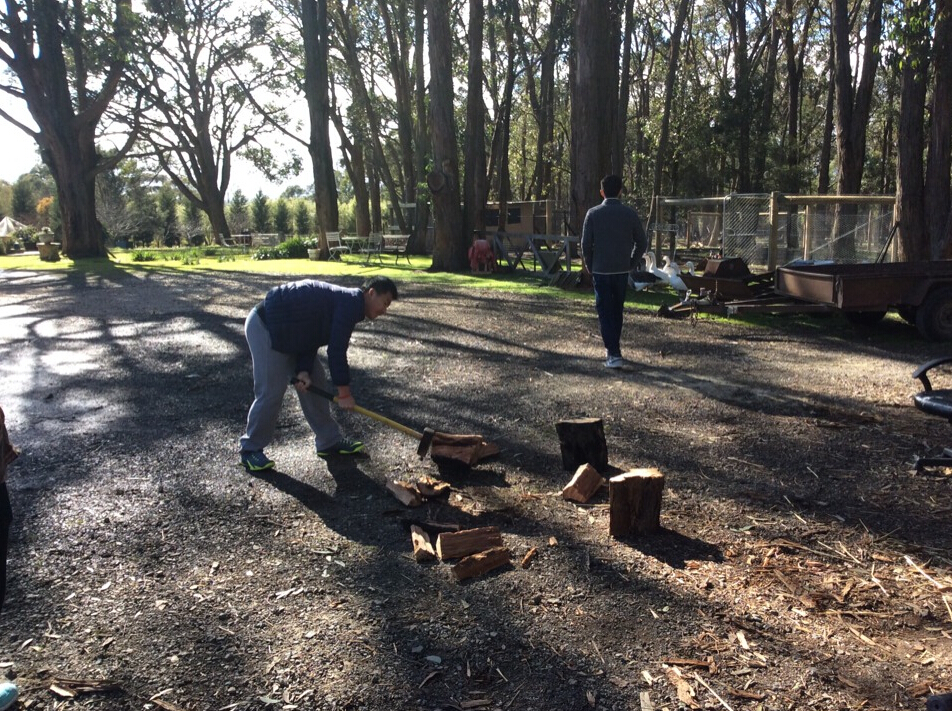 农场主家有一只黑色的狗,他非常聪明,也很热情,一直围着我们蹦来跳去。然后农场主带我们来到了自己的房间,简单收拾了一下行李,我们就开始了体验活动。在屋外的小屋子里,取了些木头,农场主开始向我们演示如何劈柴,演示过后,由我们亲自实践,我们挥舞着手中的斧头,向木块砍去,看着容易,做时难。不是劈歪了,就是没力气,但是功夫不负有心人啊!我们还是带着满满一车的木条回到了屋子,生上火,便又开始喂食动物了。