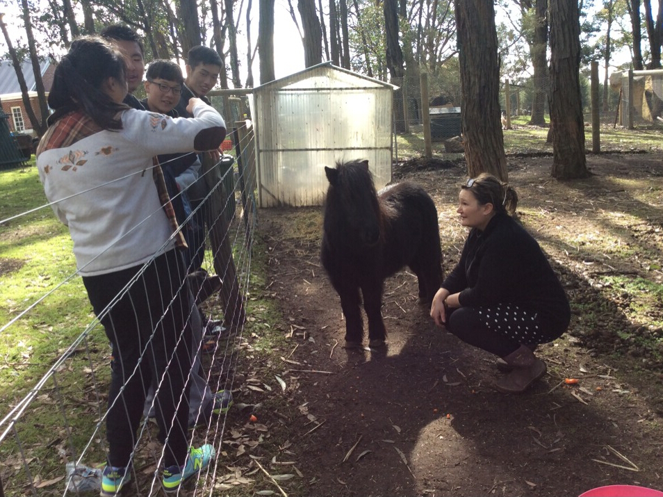 农场主先把养鹌鹑的笼子打开,进行清理,还拿了一颗小鹌鹑蛋给我们。然后,拿了一个袋子走到羊圈旁边,拿出一袋面包给我们,让我们进行喂食,饥饿的羊群不一会儿就全部抢光了,我们还看到一只黑色的羊驼,可是他却非常害羞不愿与我们亲密接触,据农场主说一共她一共有十只羊驼,还有九只在另一个牧场。过了一会儿,农场主拿了一堆干饲料给我们,我询问了一下能否到里面喂食,她答应了,我们带着干饲料进入羊圈,羊群一拥而上,开始抢着,吃着。我们试着靠近羊驼喂它,可是我们失败了,他太害羞了以至于靠近它都是难题。喂完了羊,我们紧接着开始喂鸡和兔子,我们并没有进去,只是在外面看着。接着我们带着胡萝卜来到马圈旁,它还是是一匹小马,却是非常强壮的。伴随着正午的阳光,我们便开始了午餐,午餐过程中,我们愉快的聊天。闲聊结束,我们又开始新的体验,我们到大牧场看其他的大羊驼,农场主向我们介绍说有一只母羊驼已经怀孕,羊驼幼崽一生下来其他的农场主就会买走,因为羊驼可以保护羊群,驱赶狐狸。