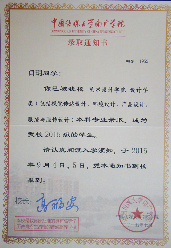 闫玥被中国传媒大学南广学院录取