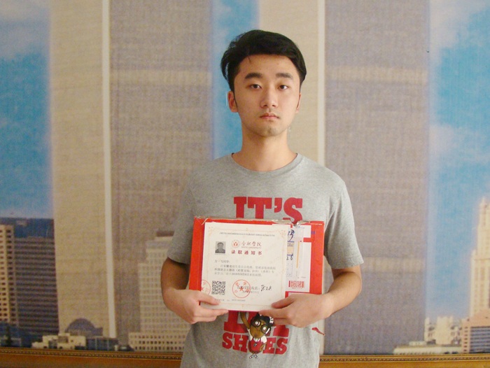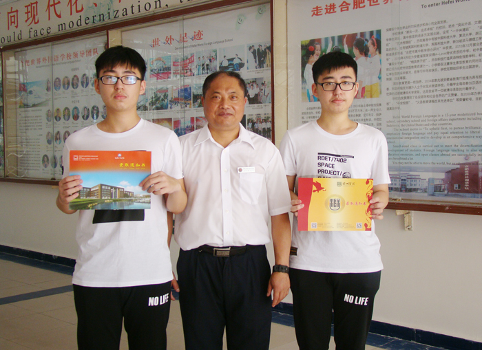 邵忠德校长与双胞胎兄弟合影(朱竞翔(左)吉林工商学院 、朱竞翱(右) 滁州学院)