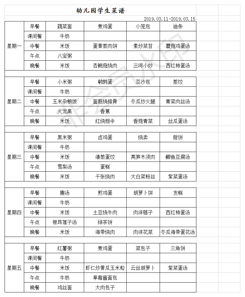 幼儿园菜单 2019.3.11-3.15