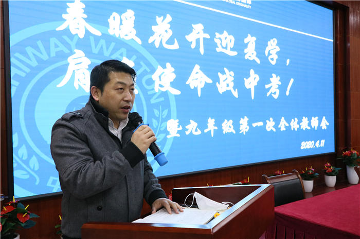 九年级组组长张宇主持此次会议。首先,几位初中部负责人对迎接九年级开学防疫工作做出具体安排。教学主任张红海对做好线上线下教育工作的对接,了解学生线上学习的情况等开学教育教学相关工作进行布置。