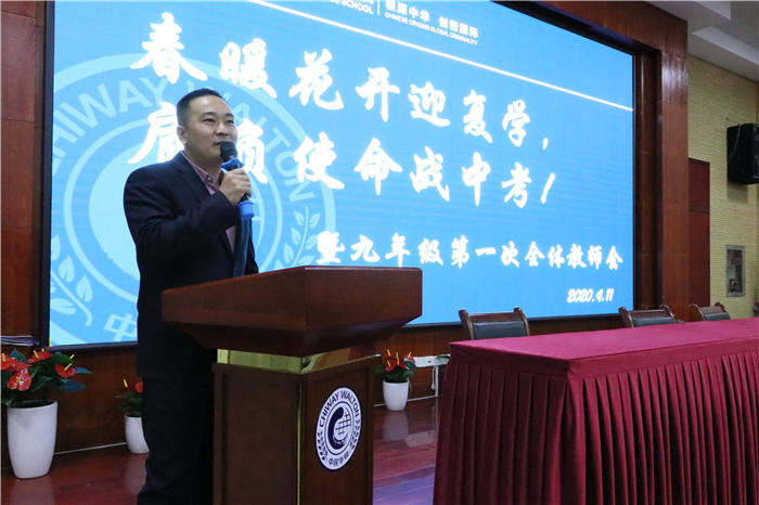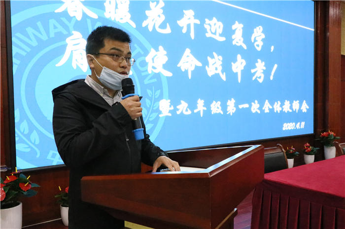 唐海平校长和钟卫副校长对九年级开学工作做总体要求。钟卫副校长指出,在严格做好日常防疫工作和检查的同时,也不可以忽视教育教学。对于线上教学不完美的地方要采取相应的补救措施。他说,要激发学生的主观能动性,秉持着“有差异,无差生”的原则做好毕业班工作。