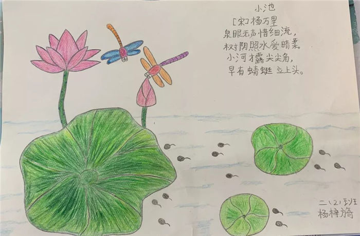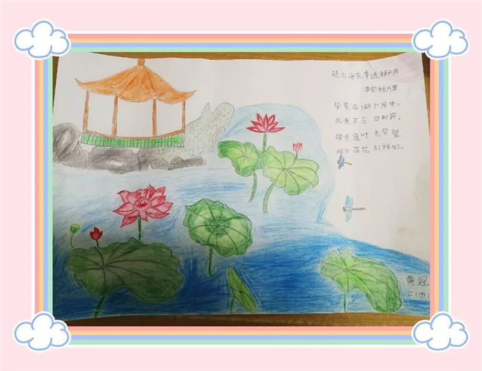 活动中,同学们为自己的古诗配上了相应的图画,把自己体会到的诗的意境、情感变成生动鲜明的图画。不少学生的作品构思独到,情景逼真富于诗意,诗与画融为一体,达到了“诗中有画、画中有诗”的艺术境界,在培养学生的想象能力的同时真实地反映出世外学子对诗歌的个性理解及他们对古诗的热爱。