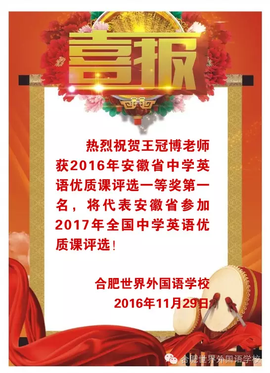 时值岁末,代表合肥市参赛的王冠博老师,在安徽省中学优质课大赛中摘得桂冠,为合肥教育的壮美画卷增添了靓丽的一笔,让我们祝愿王老师在2017年的全国比赛中,再创佳绩,展现安徽英语教师的“皖”美风采!