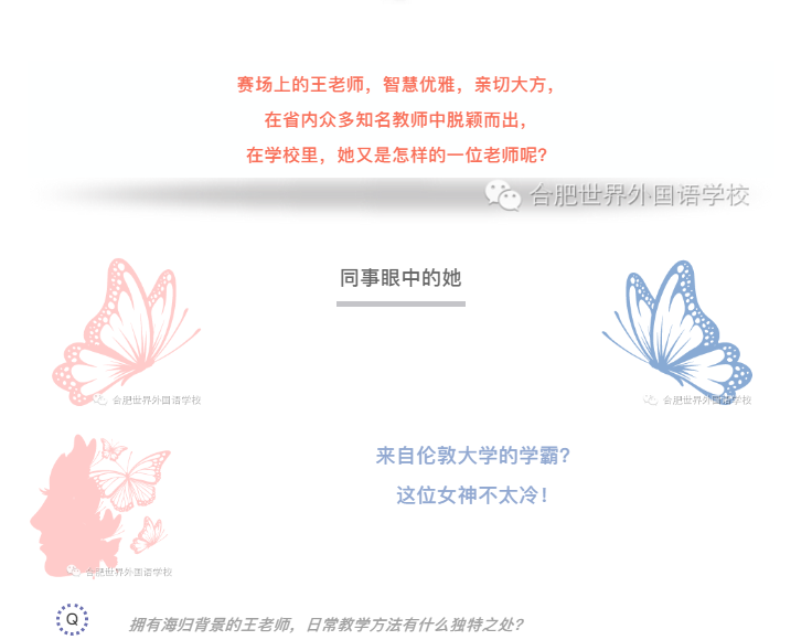 她总能轻易抓住我们的眼球。 标准的英文从她嘴中吐出,活跃的思维在她的脑中急速转变。使枯燥的英文变得生动,使生硬的课堂变得有趣。她常 用英文展示我们所关注的话题,让我们用正确的语法说出心中想要表达的句子。在课堂上导入流行的英文歌曲,让我们像她一样讲出标准流畅的英文。我们都喜欢她。她总能让我们重新认识自己,将自己置身于正确的位置,为自己鼓掌。我的学生时代,是一曲无声的歌。有多少形形色色的人漫步走过。王老师,您是我心中最美的音符。如彩虹般绚丽,照亮我懵懂的时刻。(八年级菁女子班 方孝然)