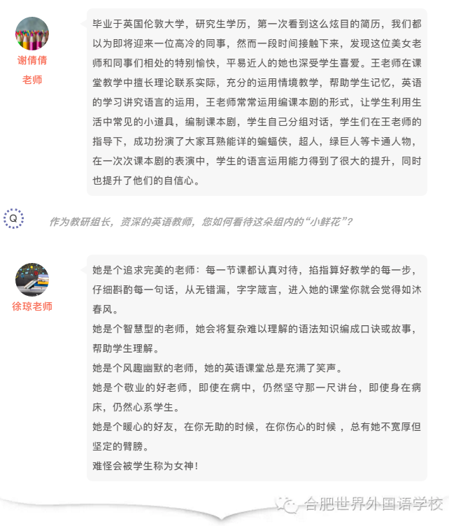 “问渠哪得清如许,为有源头活水来”。作为合肥市参赛代表,王老师的这堂阅读课,不仅是教师个人扎实专业素养的体现,是世外英语特色教学的结晶,更凝结着市教研室专家、学校领导及同组一线教师的大量心血。在赛前,合肥市教研员王德美老师多次莅临世外,精心指导王老师精设计教学,反复打磨。在专家的关心帮助下,王冠博老师的教学视野不断拓宽,教学思路逐渐明确,教学细节日趋完善。学校高度重视,为王老师专门成立了备赛团队,同组教师间进行了大量的教学研究,为这节课反复切磋打磨。经过多方合力,最终这堂课得以完美呈现,并取得优异的成绩。
