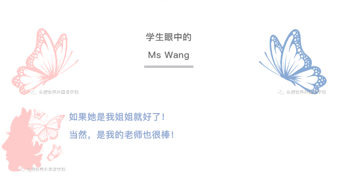 Miss Wang,是一位认真,负责的老师,是一位善良美丽大方的大姐姐,我们都十分的喜欢并敬佩她。Miss Wang是一位海归,她曾在英国留学五年,拥有丰富的见识和极高的英语教学水平。在课上,Miss Wang总会用她那特有的伦敦腔带领我们遨游在知识的海洋,她给我们补充了许多英语课上老师没有讲到过的知识点,使我们的英语成绩得到了很大的提升,我们都十分感谢Miss Wang。在课下,Miss Wang总会为我们讲几个英语笑话,逗得我们每次都会哈哈大笑。有时,她还会参与我们的游戏中,仿佛和我们不存在着年龄的隔阂……(八年级精英男子班 郭佳鑫)