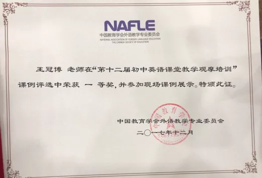 热烈祝贺王冠博老师荣获第十二届全国初中英语课堂教学大赛一等奖!