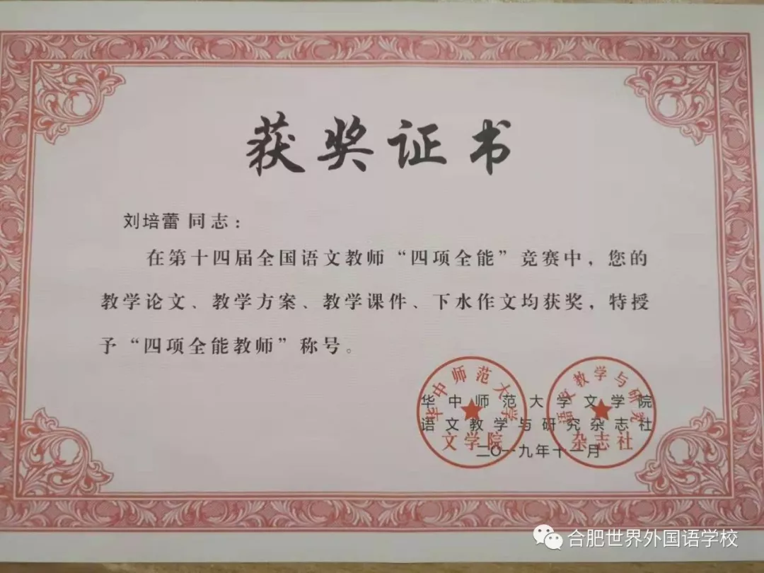 在第十四届全国语文教师“四项全能”竞赛中,刘培蕾老师的教学论文项、教学方案项、教学课件项、下水作文项均获得一等奖,特授予“四项全能教师”的荣誉称号,同时,刘培蕾老师撰写的论文《活灵活现,妙笔生花—以部编版教材为例谈小学语文作文教学的有效策略》经全国语文统编新教材高端培训会专家组评审,被评为一等奖。