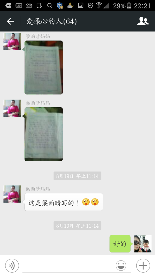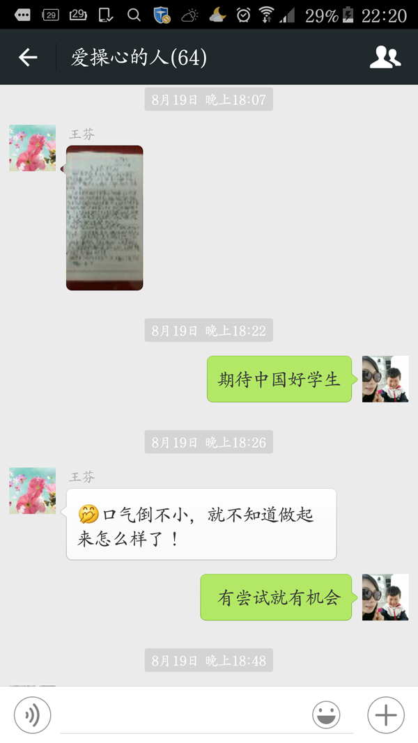 好日子总是一闪而过,两个月的暑假已经接近尾声了。在这个假期中,“爱操心的人”微信群就一直响个不停,从开始自定“暑假计划”和“每日作息时间表”,到假期中的每十天一次的作业检查,再到孩子们交流自己在假期中参加的各种实践活动……大家在群里对自己的假期生活从学习到各种活动都进行了较全面的交流。