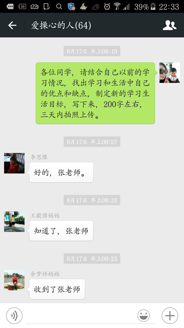 快开学了,我在群里就布置起了新任务:要求孩子们结合自身的优缺点,拟定新学期的学习生活目标,按时上传。孩子们大了,动作可真快!冀锦鹏是第一个上传的,他平时的学习还有点偷懒,这次假期除了每次都认真完成作业,还在学习吉他,他对自己的缺点不但总结得很全面,并且提出了解决的办法,对待学习的态度有了很大的转变,看来假期收获不小!华文浩在妈妈的帮助下认真对自己的学习生活情况进行了回顾,并且给自己定下了“做中国好学生”的目标。好呀,新学期,看你的啦!……还有的孩子都开始打点行李,做开学准备了!