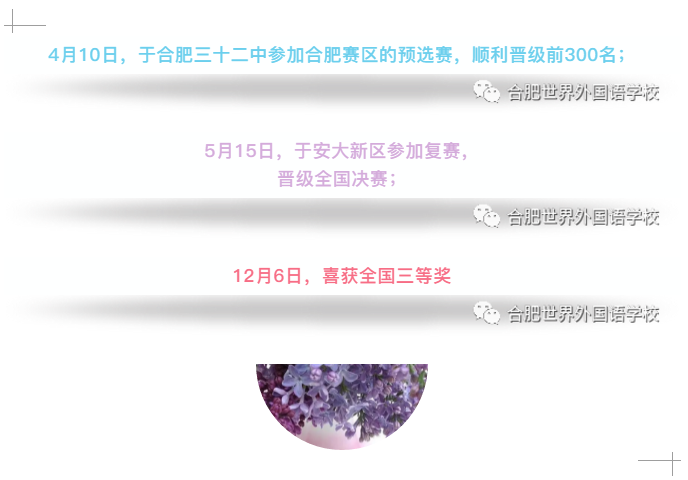 回顾这竞赛历程,就如每每闻到丁香花的清新味道,就在期待暂埋砂石下的洁白玉石发光。四月,浪漫的紫丁香一簇簇绽放,梦幻般的芳香阵阵袭来,这也同样是丁香皓珉同学生物竞赛的启航时刻。