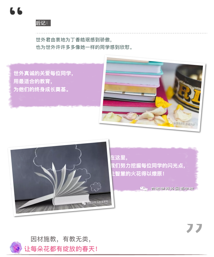 像丁香这样的同学,在世外有很多。他们或是小小诗人,或是理科学霸,或是文艺爱好者,世外将他们的兴趣爱好和学习有机融合,用丰富多彩的校本课程或社团活动等形式,给予了他们正确的引导和最大的支持。