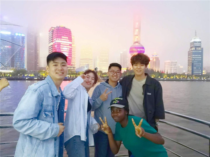 黄昏之际,南京路的天空开始下起淅淅沥沥的小雨,整个魔都在雨水的冲洗下更加充满生气。天色渐暗,我们步行至江岸,登上了黄浦江的游船。华灯初上,江岸夜景璀璨斑斓。学生们兴奋地来到甲板上,在烟雾迷蒙中遥望对岸耸立的高楼,倾听着江水涛涛奔涌的声音,也向邻船甲板上观景的游人招手问候。