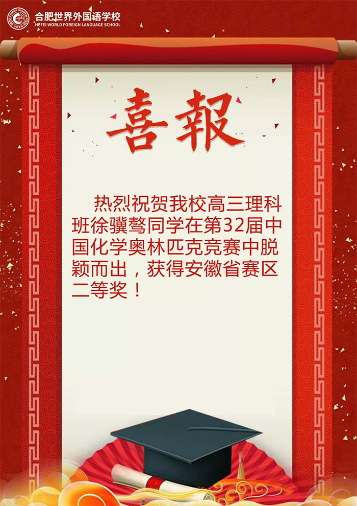 暖风徐来,一个喜讯从中国化学会传来:在中国化学会主办的第32届中国化学奥林匹克竞赛中,合肥世界外国语学校高三理科班徐骥骜同学从众多参赛选手中脱颖而出,获得安徽省赛区二等奖。这是对我校自觉践行新发展理念的最佳诠释,也是对我校高中部广阔发展前景的有力注脚。在此向获奖同学表示热烈祝贺!向为之辛勤付出的指导老师刘兵老师表示衷心感谢!
