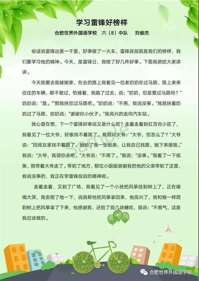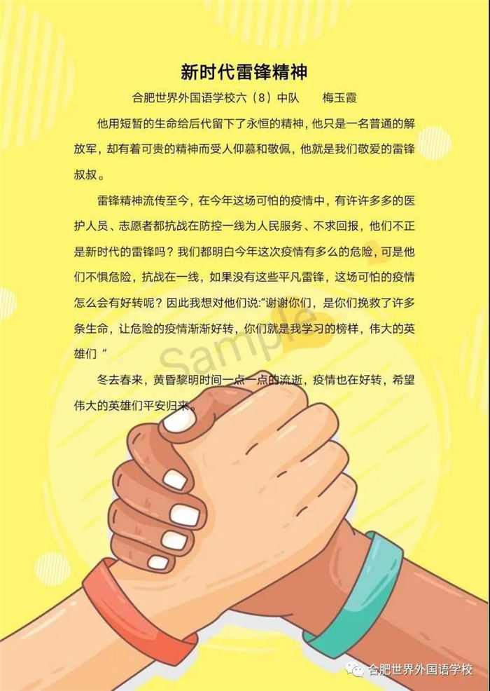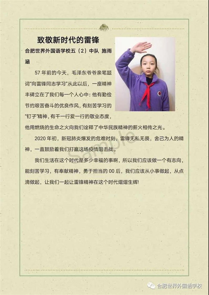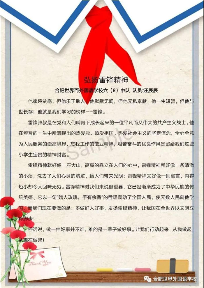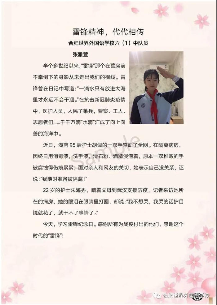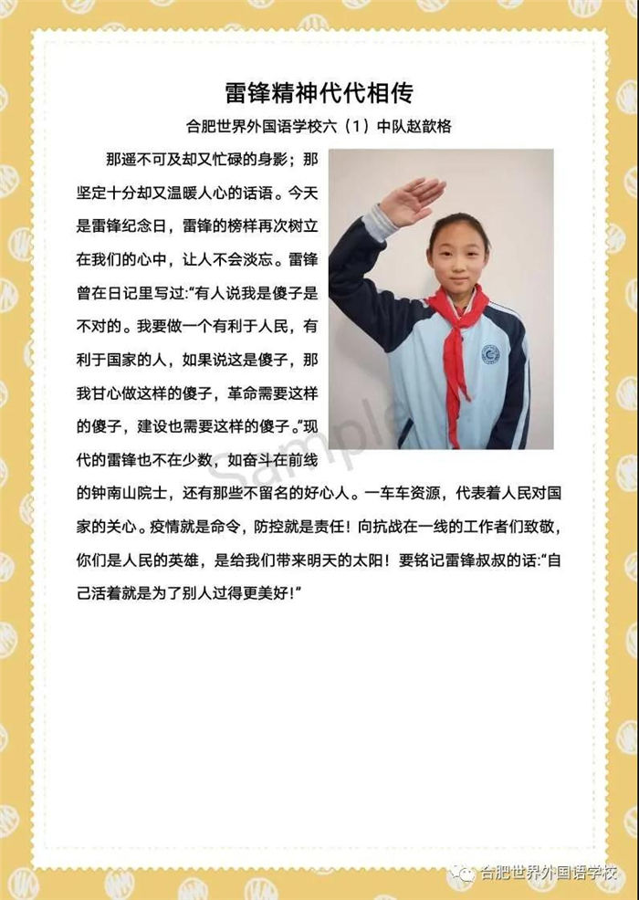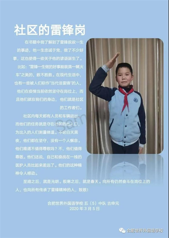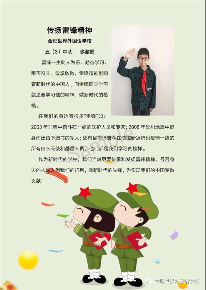 3月5日是学雷锋日,合肥世界外国语学校少先队大队部开展“寻找新时代的雷锋精神”主题活动,积极引导我们的少先队员从小学先锋,长大做先锋,一直把“雷锋精神”传承下去。