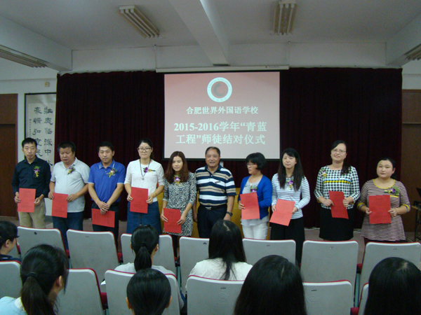 在历经了一年的求实探索,我校“青蓝工程师徒结对工作”已初见成熟。一年来一批年轻的教师在师傅的耐心指导、精心打磨下,教学能力有了质的飞跃。9月29日上午,我校“第二届青蓝工程师徒结对仪式”正式启动,新一批的年轻教师在校报告厅举行了神圣的拜师仪式,一批新的师徒关系即将在世外的教坛上绽放。本次仪式由张永国校助主持,学校20多对师徒及学校领导班子参加了仪式。仪式简短朴实,首先是张永国校助宣读了第二届师徒结对的名单,接着何全胜副校长宣读了师徒协议,明确了每一位师傅肩上的职责,规划了师徒之间在这一年内要完成的任务。协议宣读完毕后,师徒共同签订了此协议,徒弟给师傅戴上胸花,并深情鞠上一躬,这深深地一躬有敬意,有期盼,有信任,有对未来教学工作的信心与力量。师傅们更是从邵校长手中接下了红彤彤的师傅证书,这证书代表了学校对师傅们的信任,代表了学校对年轻教师的关爱,代表了世外对学生的负责,代表了世外求实务实的教学态度。邵校在仪式的总结发言中更是明确提出:作为新教师一定要好好利用这个平台,学习师的教育教学经验方法,形成自己独特的教学风格与特色。作为师傅,你们已是世外教师队伍中的中坚力量,希望你们毫无保留地指导徒弟,让他们快速成长,成为世外校园新的教学亮点。