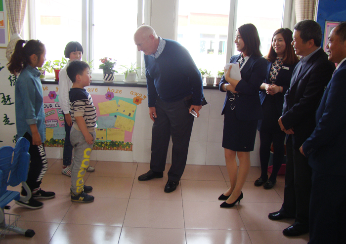 参观完校园,考察团一行召开了座谈会议。查凯局长介绍了合肥市基础教育及国际化办学情况,王杰才副书记介绍了我市教育国际合作与交流情况。Lambert Okma校长以考察行程中的具体经历,表达了对合肥教育的赞赏,认为正是因为合肥的经济和教育环境越来越与国际接轨,并飞速发展,促使他坚定了在这里找到国际教育先进理念契合点的决心。这位创办美国著名的IA高中的校长,也表达了对世外教育理念的肯定,感受到世外的教育理念与教育成果相融合,这在当今国际教育领域十分难能可贵。接着,Lambert校长介绍了他在美国学校的IB课程(国际文凭课程),这一被全球教育界认可为具有较高学业水准的教育项目,被广泛的大、中学所接受,在全球范围内迅速发展、壮大,成为各国学生考取国外大学的最理想选择。