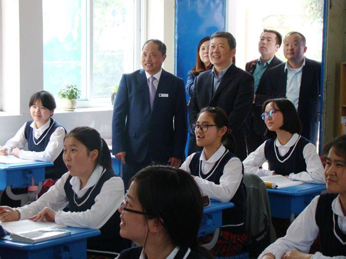 下午两点半,考察团在邵忠德校长的带领陪同下对校园进行参观。来到国际部三年级,此时孩子们正用英语和外教班主任Michelle自如交流,看到考察团进入班级,孩子们热情主动地问好。多才多艺的Josslin,还当场为Lambert Okma即兴演奏钢琴。孩子们彬彬有礼的态度,流畅的英文口语,赢得了来访客人的高度赞扬。随后Lambert Okma校长一行又来到了小学部的艺术班、高中部日语、英语和德语实验班、和初中部的菁英女子班。在菁英女子班教室,朱曼徽和徐霏垚两位世外闺秀,落落大方地向来宾介绍了班级和独特的课程,无论是女性修养课程,还是英语+小语种的语言拓展课,都给来宾留下了深刻的印象。最后,考察团一行还意犹未尽地来到了世外音乐艺术中心,音乐教室里,高中艺术班学生正在上声乐课,琴声悠扬,歌声悦耳,考察团一行不由得驻足聆听。