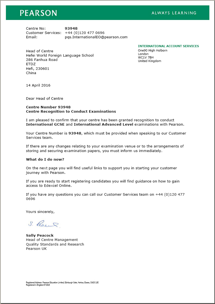 热烈祝贺我校成为英国Edexcel A-Level 考试中心
