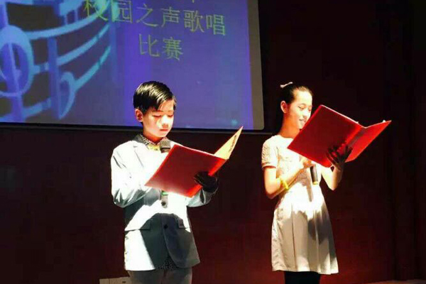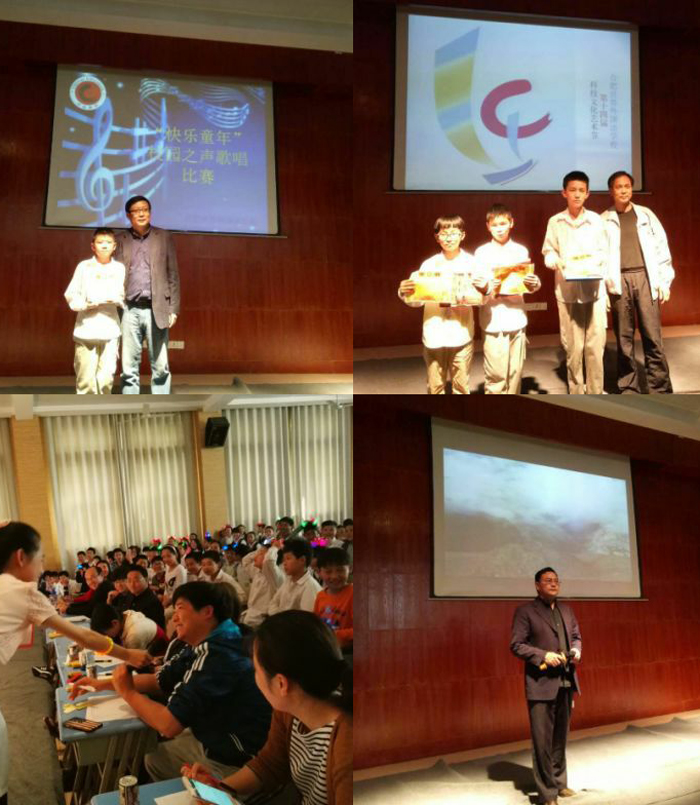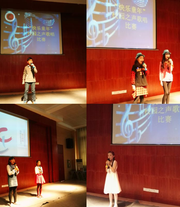 最精彩的环节应该是4月21日下午进行的歌咏比赛活动,为了营造更好的比赛氛围,我们的夏组长可没少花心思,凭着她多年积累的组织活动的经验,将此次歌咏比赛活动安排的十分完美。首先利用周日晚自习时间将各班选手聚集一起进行海选,经过两轮海选最终确定决赛学生名单,接下来选手抽签比赛顺序、制作节目单、评分表,制作PPT、编排主持词,确定小主持人,邀请评委老师,购买奖品等。比赛前小选手们在老师的感染下,也行动起来,服装,化妆,个个都想把自己打扮的漂亮一些,想为班级争得最高荣誉。为了让孩子们更美一些,更自信一些,我们可爱的高凡老师,准妈妈王苗苗老师牺牲了中午休息时间来给孩子们造型打造,真是精神可嘉。比赛共有25首歌曲,有独唱,合唱、重唱、齐唱多种形式,孩子们表现的真棒!动作,音准真是像模像样,还真有明星的风范,当他们自信地踏上舞台的那一刻,相信音乐家的种子已在这里生根发芽。经过专业评委老师的打分,最终确定获奖同学名单,奖项分别是:特等奖最佳潜质奖1名;一等奖2名;二等奖3名;三等奖4名;最佳造型、表现力奖各一名,优秀奖若干名。看,台上领奖的同学笑的是多么灿烂,相信这美好的瞬间,一定会成为他们儿时最美好的回忆!此次活动中还有一大亮点,在汇总比赛成绩期间,大家都在焦急的等待着比赛结果,机智的小主持人为了活跃气氛,突发奇想,现场邀请台下的老师上台献唱一曲,这可难不倒我校多才多艺的老师们,在大家的欢呼声中,我们的数学老师罗后同老师现场挑选一曲《九寨之恋》,他的演唱声音洪亮,悦耳动听,现场气氛再次活跃起来。如果不是此时比赛结果已经出来,相信同学门肯定还会要求他再唱一曲。此次歌咏比赛何全胜副校长,方仁武主任,张磊副主任和韦媚副主任也来到了现场,领导们的亲临也更让孩子们信心十足,尤其是得奖的同学们,当他们从领导的手中接过奖状时,心里都乐开了花。本次的活动也吸引了家长们慕名来观赛,比赛结束后家长给予了高度好评。