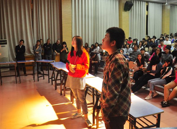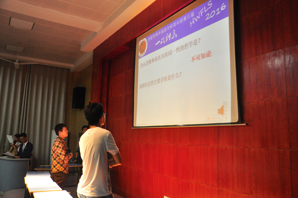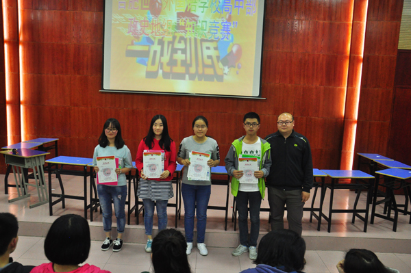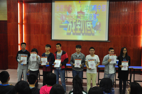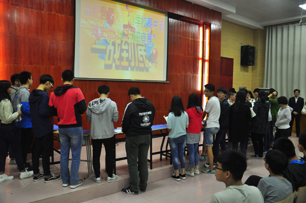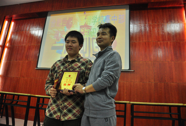 此次活动是一次比较大规模的有奖竞赛活动,同学们的参与热情度都很高,每位同学都积极准备,竞赛现场非常精彩。比赛在陈宇辉、房泽坤同学的主持下拉开序幕,选手以富有个性的语言介绍完自己后,比赛正式开始。高中部吴琪琦主任在开场中就动员选手要认真对待,同时要发挥“友谊第一,比赛第二”的精神,在吴主任的讲话中拉开了本次比赛的序幕。现场竞争异常激烈,选手答题沉着冷静,现场气氛紧张而热烈,选手的精彩表现多次将现场的气氛推向了高潮。经过一轮又一轮激烈的角逐,最后高二(2)班的张容德同学以渊博的知识、沉着的表现战胜新战神,连任合肥世界外国语学校高中部第三届“一战到底”活动的战神。