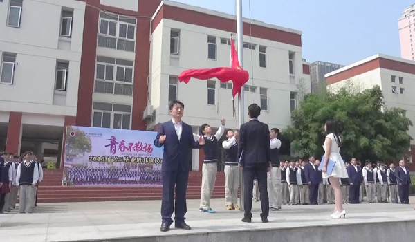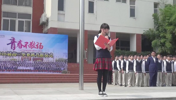 5月30日上午9点半,我校全体师生在操场举行升旗仪式。高中部高三(1)班蒋昊宇同学和高三(3)班戴光伟同学共同主持了本次升旗仪式。高三(1)班蔡丽丽同学发表了以《感恩母校,扬帆起航》为主题的精彩演讲。高三音乐班全体学子演唱歌曲《老师我想你》表达对母校、老师的深情。邵忠德校长为2016届高考冲刺授旗并致辞。