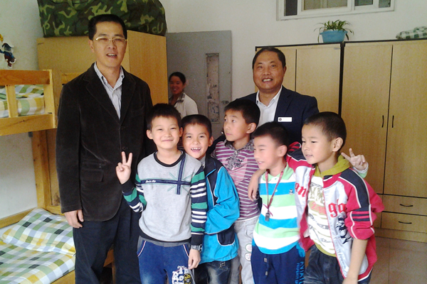 临近中午时分,董事会结束各项议程,钱总等集团领导在校园内实地查看,此时正值小学生吃完午饭,排着整齐的队伍返回寝室,孩子们见到钱总等一行非常有礼貌的喊“伯伯好!阿姨好!”钱总向孩子们挥手致意。钱总非常关心孩子们在校的学习生活情况,他走进学生们宿舍,与孩子们亲切交谈,并与他们合影留念。