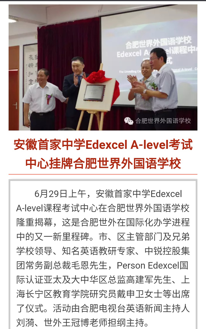 安徽首家中学Edexcel A-level考试中心挂牌合肥世界外国语学校
