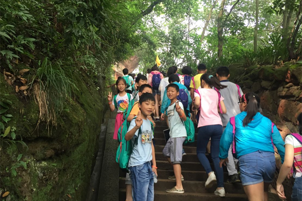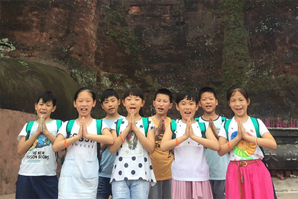 首先我们来到了乐山大佛。它坐落于乐山城东的岷江、青衣江、大渡河三江汇流处,是世界上最大的弥勒佛,素有“佛是一座山,山是一座佛”之称。传说有位高僧“海通法师”,因见这三江水汇聚之处常年惊涛拍岸,浪涌潮跃,过往船只无一幸存时,便立下宏誓:开凿佛像!欲以此佛像来仰仗其无边法而致暴浪为安流!后历尽了艰辛,终凿铸了这尊石佛坐像。 如此的毅力与善心,让孩子们受益匪浅。当我们徒步到山脚下时,孩子们远远的就惊呼起来——“看到了大佛了”,每个人都纷纷的拿出了自己的手机与大佛合影留念。当我们仰望那遥不可及的鼻尖的时候,铺面而来的渺小感瞬间侵袭心扉,让人沉浸于古时人类的卓越工程带来的震撼。