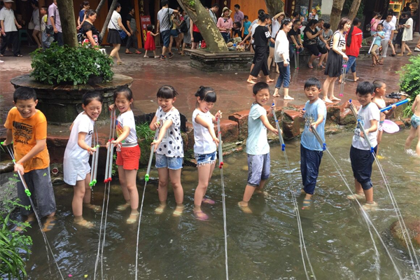 欣赏完雄伟壮观的大佛后,我们来到了心目中期待已久的黄龙溪,这里是一个山、水、城为一体的古镇,已有近百年的历史。街面不宽,青石铺成凹凸不平的小路,精致古朴的栏杆雕花,古色古香的亭台楼阁,可以说这里孩子们水上的世界和快乐的天堂。一进入黄龙溪我们被清澈的溪水吸引住了,孩子们已经迫不及待的想踏入溪水去感受水的清凉,每个人手中拿着着各式各样的喷水枪,他们在水中进行了一场激烈的水枪大战,你追我赶,相互喷射,被喷到或没喷到都相视一笑。到处是一片热闹非凡的景象。喊叫声、喷水声、笑闹声此起彼伏。只见一条条晶莹的水龙在穿梭的人群中上下翻腾,一阵阵愉快的笑声在水雾中不断回荡。幸福和快乐洋溢在每个人的脸上。
