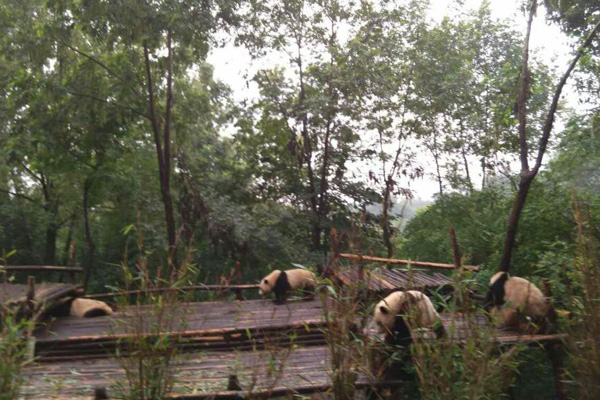 天公作美,昨夜的小雨带走了炎炎的暑热,早晨我们带着喜悦的心情走进了成都大熊猫繁育研究基地。这里空气清新,树木挺拔,鸟语花香,翠色欲滴,仿佛走进了原始森林。我们很幸运,漫步在园林里,看到了很多憨态可掬的大熊猫在室外活动。它们有的抱在一起嬉戏,有的躺在木板上休息,有的在悠闲的吃着竹子,有的在练习爬树。这么可爱的大熊猫引得孩子们啧啧赞叹。