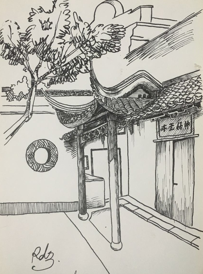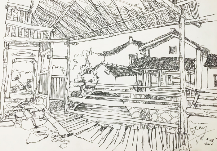 游览毕,回府息,一夜无事。翌日旦时,有微信来报,合肥天气不佳,然天公作美,呈坎雨停风住,云开见日,正是写生的大好时机。